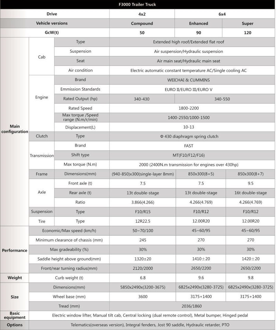 In terms of Details, quod potentia System ofshaecman F3000 6x4 & 4x2 Caput tractor salsissimus vir vivens instructa cum Weichai vel commins summus potentia engine. Et transmissione ratio est vexillum cum citius XII-celeritate vel XVI, celeritate manual tradenda, et quaedam exempla instructa cum ipso ipso transmissione. Cabs sunt available cum alta tecto vel extenditur plana tectum et interiora facilities ut airbag inpulsa-absorbing sedes et automatic aer-condiciones omnes available. Et chassis et suspensionem capere technology, et aeris fontes sunt in tergo suspensionis de aliquo exempla monstrabit ad augendae consolationem et onus-portantes facultatem.