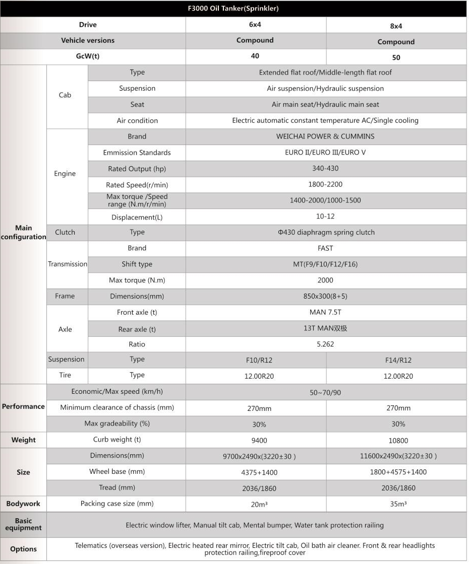 In terms of Product Details, in Engine Skacman F3000 6x4 & 8X4 oleum cibus cisternina salsissimus vir vivens est ex variis exempla, cum maximam horsepower usque ad 400hp, princeps torque, cum maximam horsepower usque ad 400hp, princeps torque, cum maximam horsepower usque ad 400hp, princeps torque, bonum accelerato perficientur, et potest aptet ad diversas operationem conditionibus. Transmissio est maxime ieiunium manual tradenda, quae potest animadverto infinita celeritate mutatio, expand in range de driving rota torque et celeritate mutatio, et amplio adaptability et salsissimus vir vivens. Internum laminis summo-loading tank formatae in unum ire per nere cum imitatio linea spheara apparatus ad augendae fortitudinem et signantes; Et exterior Skacman F3000 6x4 & 8x4 oleum cibus cisternina salsissimus vir vivens is offa-palevit, ut eliminare Weld accentus et removere rubigo ad prolongitatem servitutis vitae. Et Skacman F3000 Tanker salsissimus vir vivens etiam instructa cum provectus apparatu ut submarine valvulae, Europae vexillum piscinam portus, anti-redundantiam speciem ad curare salute et environmental praesidium in onerariis.