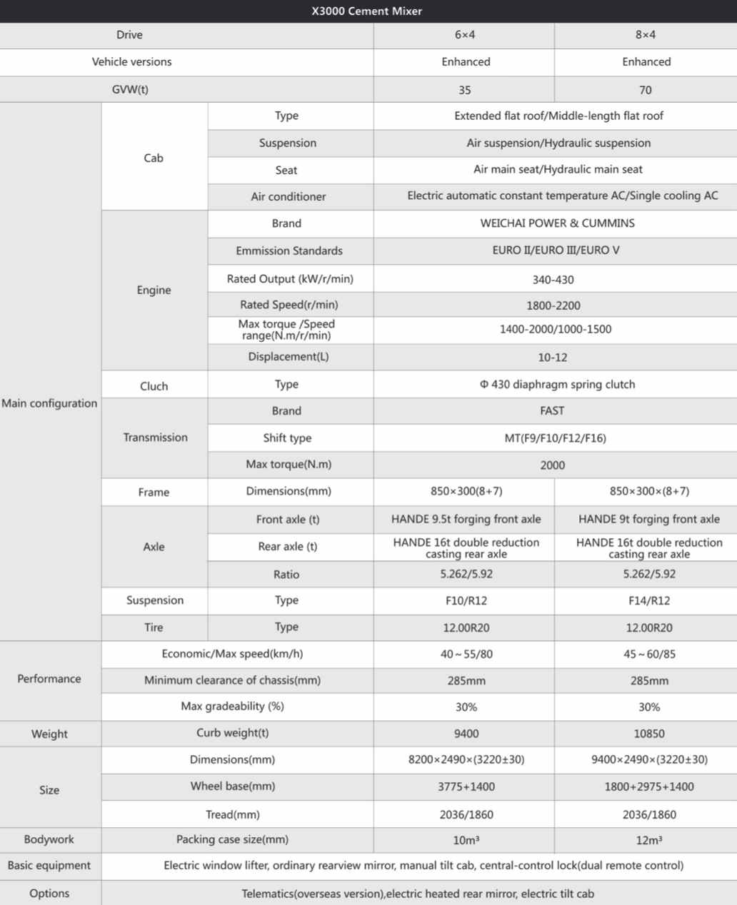 Chassis instructa cum Wuxi Chaiwei WP10 / WP12 engines, cum maximam potentia vndique a CCCL ad CDLX horsepower. Est matched cum Fatii XII-celeritate tradenda et manus hominis technica axis, idoneam ad complexu constructione site conditionibus. Et CAB adoptat a quattuor-punctum suspensionem consilio et instructa airbag inpulsa-absorbing sedes, significantly enhancing ad coegi est consolationem. Et cisternina superficies subeundes anti-corrosio Sandblasting curatio, et ad libitum RAMULUS ratio potest installed ne concreto ex adhaerens. Tergo missionem Chutturus CCLXX gradus et operatio vecte est centraliter disposita dextram partem vehiculum facilitando una persona precise imperium. Et omnis vehiculo obsequitur cum nationalibus vi emissiones signa et efficiens et environmentally amica concretum translationem solutio ad urbana constructione projects.